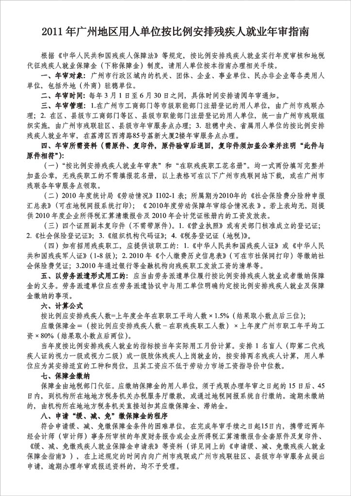 根據穗殘聯就業[2011]75号《關於廣州地區用人單位辦理2011年按比例安排殘疾人就業年審的通知》及附件《2011年廣州地區用人單位按比例安排殘疾人就業年審指南》的要求,凡廣州市行政區域内的機關、團體、企業、事業單位和民辦非企業等各類用人單位,包括外地(外商)駐穗單位,均應按不低於上年度在職職工平均人數1.5%的比例安排殘疾人就業。達不到規定的比例的,應繳納相應的保障金。以勞務派遣形式用式的應當由勞務派遣單位履行按比例安排殘疾人就業或者繳納保障金的義務。勞務派遣單位應在勞務派遣協議中與用工單位明確約定按比例安排殘疾人就業及保障繳納的事項。 計算公式爲:應繳保障金=(按比例應安排殘疾人數-在職殘疾職工人數)×上年度廣州市職工年平均工資×80%(結果取小數點後兩位)。 在有關部門未正式公布2009、2010年度廣州市職工年平均工資之前,2011年征收2010年度的保障金,暫按2008年度全市職工年平均工資45365元的80%(即:36292元)計征,待新數據公布後再行調整。 上述應繳的殘疾人就業保障金由地稅部門代征。